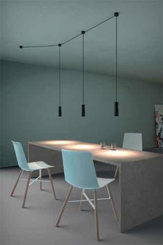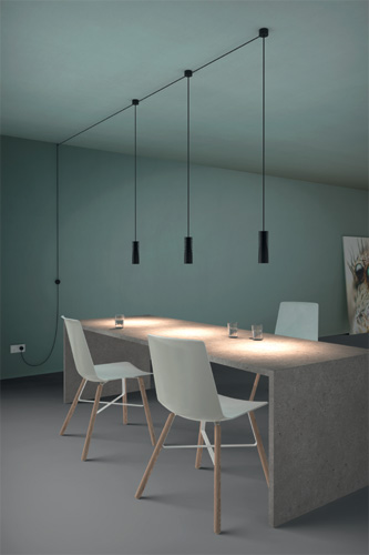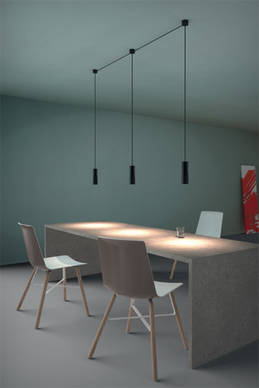 Integriert in die Leuchten-Installation an der Decke kann mit ihnen aus der sichtbaren Verkabelung eine gewollte, grafische Rauminstallation entstehen. Wie eine Skizze im Raum. Eine saubere Installation ohne Schlitze zu schlagen ist selbst dann ein Kinderspiel, wenn kein Deckenanschluss vorhanden ist und die Pendelleuchte an eine Wandsteckdose angeschlossen wird.