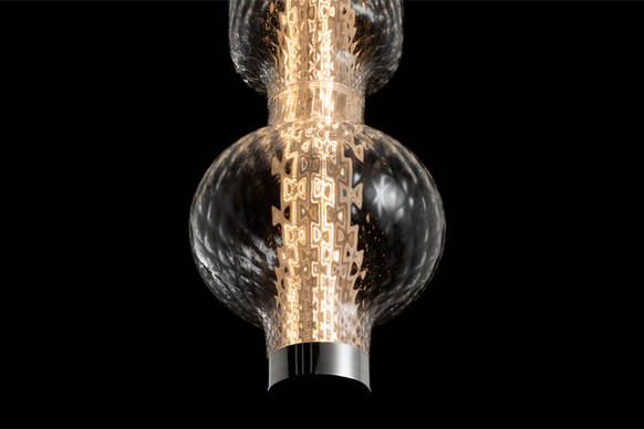 Tradition neu interpretiert - Für seinen expressiven Leuchtenentwurf setzt Designer Neil Poulton auf die Neuinterpretation einer traditionsreichen Technik von der venezianischen Glasbläserinsel Murano: Beim sogenannten „Balloton“-Verfahren wird das noch heiße Glas in eine spezielle Metallform mit rautenförmigem Muster geblasen, sodass eine gleichmäßiges, wabenförmiges Netzmuster entsteht. Auch für Alambicco werden zunächst kleine Pyramiden mit quadratischer Grundfläche in das erhitzte Glas gebrannt. In einem zweiten Schritt erhält das Werkstück dann die endgültige Form und der Glaskörper nimmt seine typisch dreidimensionale Textur an. Das Ergebnis ist ein absolutes Unikat mit edler, haptisch spürbarer Reliefoberfläche.