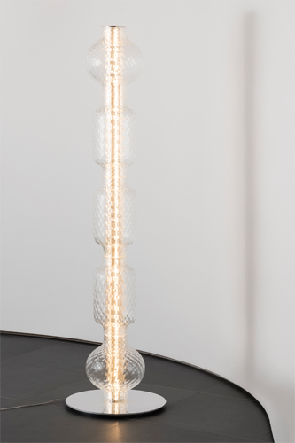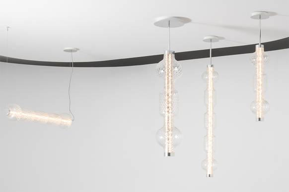 Technologisches Herzstück des Entwurfs ist dagegen die zentrale, extrudierte Aluminiumstruktur, die auf vier gegenüberliegenden Seiten LED-Leuchtmittel beherbergt. Um sie herum sind gleich mehrere Schichten arrangiert: Die erste besteht aus einem geriffelten Glaszylinder, der die Sicht auf sämtliche technologischen Komponenten von Alambicco bricht. Auf diese Weise wird verhindert, dass die LEDs blenden, ohne sie gänzlich zu verdecken. Ihm folgen die gläsernen Diffusoren mit ihren abgerundeten Geometrien. Heraus kommt ein geschicktes Spiel mit Transparenzen und Texturen: Schönheit und Eleganz des geblasenen Glaskörpers werden dabei eingefangen und das reflektierte Licht fein und gleichmäßig gestreut.