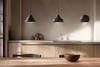 Aus lichttechnischer Sicht erzeugen die Leuchten einen präzisen, funktionalen Lichtkegel mit direkter Ausstrahlung nach unten. Im ausgeschalteten Zustand erscheinen sie vollständig schwarz und skulptural und verändern ihre Wirkung je nach Lichtsituation im Raum. Die Verbindungsstelle zwischen Korpus und Kabel ist mit einem kleinen Messingelement veredelt. Innovativ und funktional zugleich, lassen sich Alicudi, Filicudi und Panarea sowohl in öffentliche als auch in private Räume integrieren. Sie eignen sich hervorragend für die Reihung, ohne dabei an gestalterischer Vielfalt zu verlieren. Ein Projekt, in dem Material und Licht miteinander verschmelzen und das eine neue Interpretation zeitgenössischer Lichtgestaltung ermöglicht.