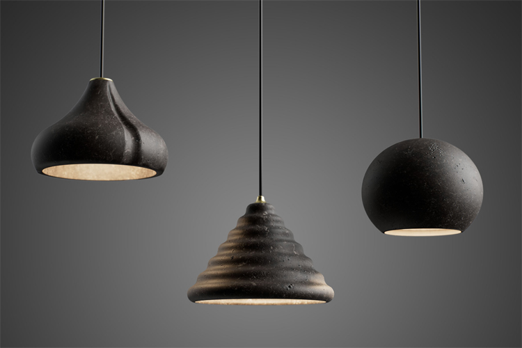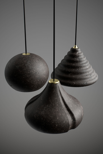 Francesco Meda erklärt: „Im Gegensatz zu Marmor wird Lavagestein nicht abgebaut, sondern direkt vom Berg gesammelt. Nach einem Ausbruch erstarrt das Magma, wird Teil der Landschaft und bildet Blöcke aus Lavagestein, die sich bearbeiten lassen. Beim Zuschnitt entsteht eine große Menge an Materialresten - diese wollten wir wiederverwenden. Das Ergebnis sind Leuchten aus recyceltem Lavagestein mit einer warmen Oberfläche, geprägt von Porosität und kraterartigen Strukturen.“
