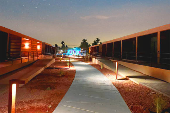 Der Hersteller Lumo FZE fungierte in dem Projekt als Lichtdesigner und spielte eine entscheidende Rolle bei der Planung und Lieferung der gesamten Außen- und Landschaftsbeleuchtung für die AlUla Film Residence. Die Verantwortlichen bei Lumo holten Tridonic als kompetenten Technologie-Partner ins Boot, da sie von dessen technischer Expertise und qualifiziertem Support überzeugt waren. Die Beleuchtungslösung umfasst maßgeschneiderte L-förmige Mastleuchten und L-förmige Pollerleuchten von Lumo FZE. Diese sind mit LCA DALI LED-Treibern von Tridonic ausgestattet und werden durch sceneCOM evo DA2 LCS gesteuert.