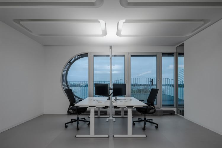 Gleichzeitig zeigte sich, dass im bestehenden Produktspektrum keine Arbeitsplatzleuchte verfügbar war, die gestalterische Zurückhaltung, normative Anforderungen und technologische Zukunftsfähigkeit gleichermaßen erfüllt. Erst die Zusammenarbeit von BAID Architekten mit Zumtobel eröffnete die Möglichkeit, diese Anforderungen in einer eigenständigen, architektonisch gedachten Leuchtentypologie zu bündeln und mit SKENA umzusetzen.