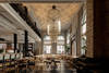 Die zylindrische Form der Leuchte nimmt die Rundung der großen Fensterbögen auf und fügt sich harmonisch in das Gestaltungskonzept ein. Sanfte Töne und natürliche Materialien wie Holz, Leder und Stahl betonen die industrielle Ästhetik des Raumes und setzen einen Kontrast zu den traditionellen Strukturelementen. Das Ergebnis überlädt den Raum nicht. Im Gegenteil: Es formt ein zeitloses Raumgefühl für diese Innenarchitektur, die wirkt, als wäre sie schon immer da gewesen.