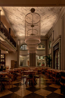 Besonders hervorzuheben ist der zentral gelegene, doppelgeschossige Hauptraum des Restaurants. Hier wurden originale Elemente des Altbaus erhalten - etwa die charakteristischen Stuckverzierungen an der Decke oder das beeindruckende Schmiedeeisengeländer. In Kombination mit den zeitgenössischen Oberfiächen des Innendesigns entsteht eine exklusive, warme Atmosphäre - perfekt, um die orientalisch-mediterrane Küche von Spitzenkoch Ryan Schmueli zu genießen.