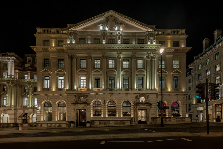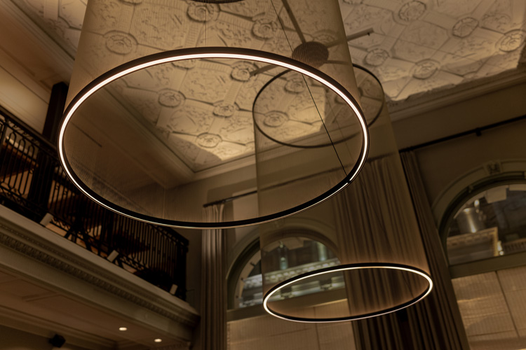 Die skulpturale Silhouette, entworfen von Umut Yamac, kombiniert von oben herab gerichtetes und nach oben abstrahlendes Licht. So entsteht eine atmosphärische Inszenierung, die den Raum umhüllt und gleichzeitig ein vibrierendes, dynamisches Spiel aus Licht und Schatten erzeugt, das die Aufmerksamkeit der Gäste auf sich zieht. Feine Spannfäden zwischen Ringen aus Aluminium gestalten drei Volumen, die mit ihrer leichten, fast immateriellen Präsenz den architektonischen Charakter des historischen Londoner Gebäudes aufgreifen.