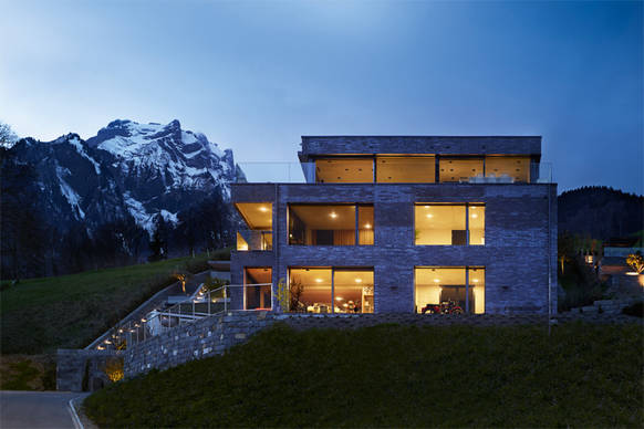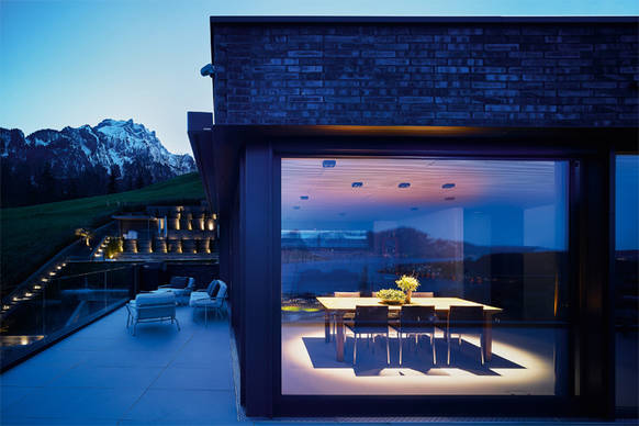 Als ausgebildeter Architekt war es Brennenstuhl ein großes Anliegen, dass diese meist unerwünschten Spiegelungen in den Fenstern ausbleiben und man „den hoffentlich schönen Ausblick in die Nacht genießt, in den Garten, über die Stadt oder wo immer das Auge hinreicht." Die Beleuchtung für das Haus am Vierwaldstättersee beweist den Erfolg des Lichtkonzepts der Nimbus Q FOUR Leuchten eindrücklich.