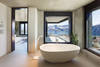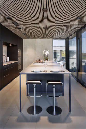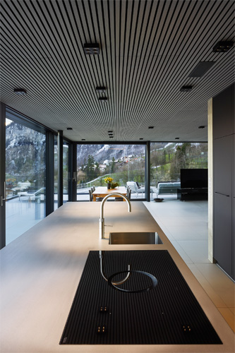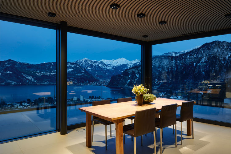 Die Schweizer Architekten haben den großzügigen Koch-, Ess- und Wohnbereich gezielt im Dachgeschoss des Neubaus arrangiert, von wo sich dank einer großzügigen Verglasung der beste Rundumblick über den Vierwaldstättersee und das Bergpanorama bietet. Damit auch abends bei eingeschaltetem Licht keine Spiegelungen der Lichtquellen in den Glasscheiben die Aussicht beeinträchtigen, setzten die Planer Nimbus Q FOUR Deckenleuchten ein.