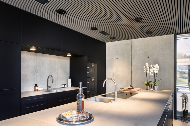 Diese Leuchtengeneration zeichnet sich über ihre optimale Entblendung und einem präzisen, fokussierten Lichtbild aus. Im Haus am Vierwaldstättersee lassen die Nimbus Q FOUR sowohl die Arbeitsfläche des freistehenden, noblen Küchenblocks und die Tischplatte des einladenden Esstisches hell und atmosphärisch erstrahlen – die Lichtquellen an der Decke treten jedoch komplett zurück, sind kaum sichtbar.