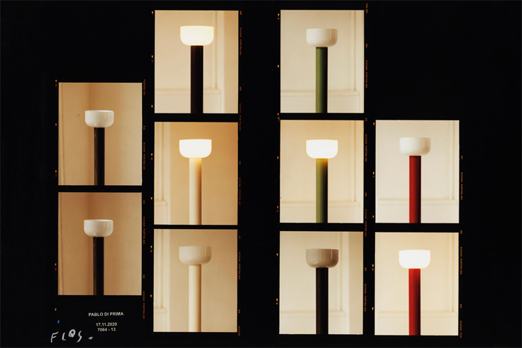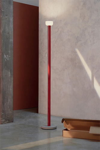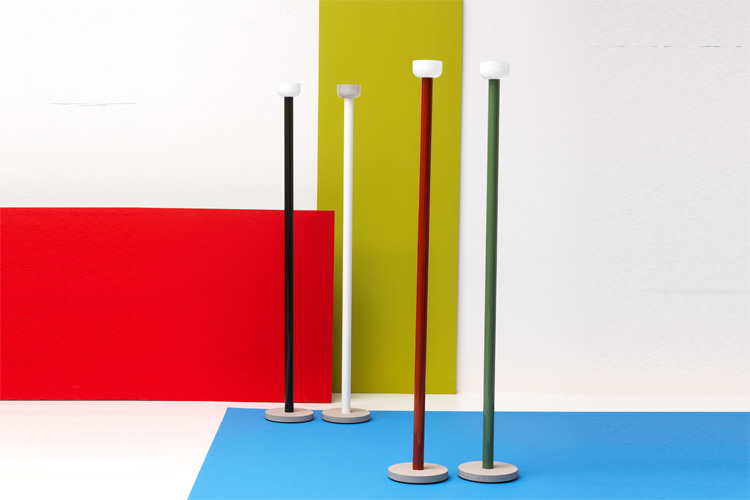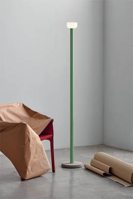 „Nach der tragbaren Bellhop und den Versionen für den Außenraum haben wir uns entschlossen, an einer Stehleuchte zu arbeiten, die in die Kollektion passt, aber eine ganz andersartige Lichtqualität bietet. Während Tischleuchten auf zurückhaltende Weise direktes Licht spenden, hat die neue Bellhop Floor einen ausgeprägt skulpturalen Charakter,“ kommentieren Edward Barber und Jay Osgerby ihren Entwurf: „Archetypische Elemente gewährleisten die Familienähnlichkeit; allerdings haben wir den Schirm umgedreht und neue Materialien eingeführt - Beton, Aluminium und Glas, kombiniert mit kräftigen Farben für den Korpus.“
