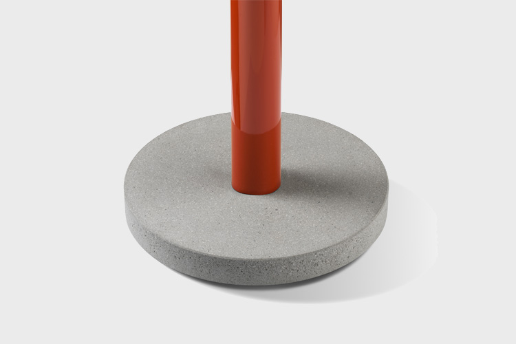 Der Sockel aus Beton fühlt sich nicht nur angenehm an, sondern gibt der Bellhop Floor auch Standfestigkeit. Ihr Korpus besteht aus Aluminium, der Diffusor aus Opalglas. Das ermöglicht es, Farben und Materialien in reizvollen Kontrasten zu kombinieren. Der Korpus ist in den Varianten weiß, cioko, grün und ziegelrot erhältlich, der Diffusor ist grau (bei der Variante mit dem weißen Korpus) oder weiß (bei den Varianten mit dem cioko, grünen und ziegelroten Korpus).
