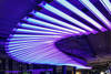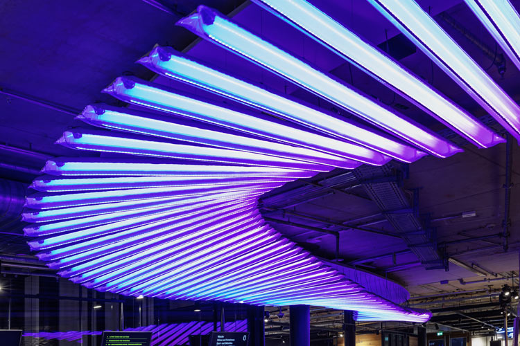 Die stabförmigen Lichtelemente sind sanft geschwungen von der Decke abgehängt. Durchaus dynamisch, aber ganz ohne Übertreibung. Die Installation ist ausgestattet mit ansteuerbaren RGBW - LED-Streifen. So bietet sie dem Kunden langfristig viele Möglichkeiten, die Geschäftsräume ansprechend, überraschend und immer wieder neu zu gestalten - mit neuen Programmabläufen, ohne Umbau.