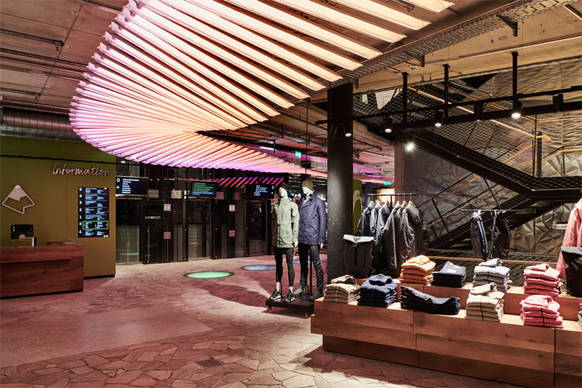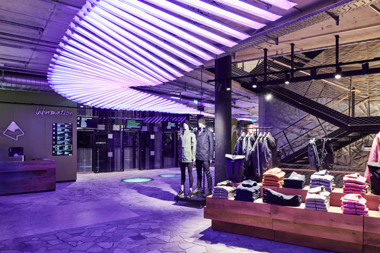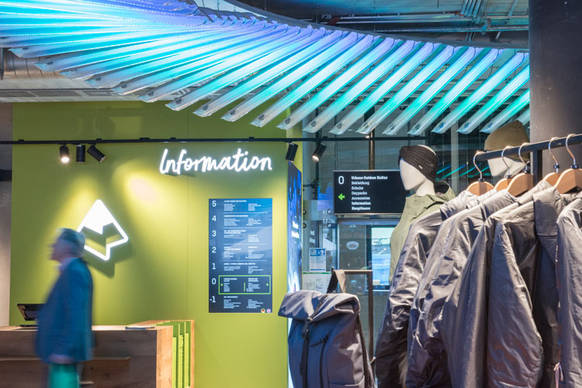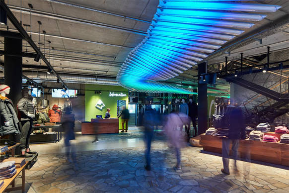 Die robusten Lichtelemente sind aus LKW-Planenmaterial. Die Unterseite ist transparent, die Oberseite hellgrau. Von der Materialität erzeugen sie Assoziationen von Outdoor- Produkten. Dadurch passen sie perfekt zum Sortiment des Auftraggebers. In jedem Lichtelement ist ein RGBW LED-Streifen eingenäht, der das Licht in den ,Schlauch' emittiert. Wahrnehmbar ist nur das reflektierte, indirekte Licht, das natürlich auch in der Helligkeit reguliert werden kann.
