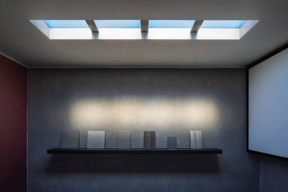 Die CoeLux-Systeme, die in Innenbereichen einen blauen und sonnigen Himmel wiedergeben, lassen eine neue architektonische Raumdimension entstehen und stellen eine Verbindung mit dem Himmel her, die für das Wohlbefinden notwendig ist, insbesondere in nicht von außen beleuchteten Räumen, in denen man sich lange aufhalten muss. Dieser Bereich des Showrooms ist auch mit Pflanzen ausgestattet, die strategisch unter den CoeLux-Systemen angeordnet sind, um die Vorteile eines Lichts, das das Sonnenlicht getreu wiedergibt, in Anspruch zu nehmen.