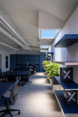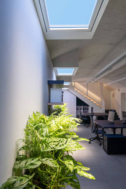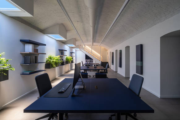Das architektonisch von einem faszinierenden Tonnengewölbe geprägte Untergeschoss bietet einen großen Arbeitsbereich, der von einer harmonischen Interaktion mit dem Licht gekennzeichnet ist und so ein gemütliches Ambiente entstehen lässt. Die Beleuchtungssysteme der Serie CoeLux HT25, die sich über die Wand erstrecken und die Arbeitsbereiche erhellen, lassen dort, wo es keine Öffnungen ins Freie gibt, eine Atmosphäre mit natürlichem Licht entstehen. Das Modul LS Array verleiht dem Konferenzraum eine vollkommen neue Perspektive, indem es einen außergewöhnlichen Oberlichteffekt schafft.