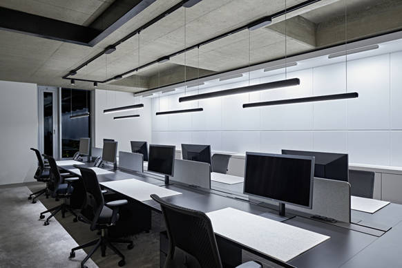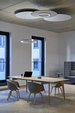 Insbesondere bei unruhigem Deckenbild oder Rohdecken kann dank der Occhio acoustic panels visuell eine zweite, homogene Ebene realisiert werden – ganz ohne abgehängte Decke. Mit ihrer hochreflektierenden Stoffbespannung schaffen die Occhio acoustic panels zusätzliche Reflektionsfläche für das Uplight der Pendelleuchten Mito sospeso und Mito volo. Die verstärkte indirekte Beleuchtung verleiht dem Raum ein angenehmes Licht.