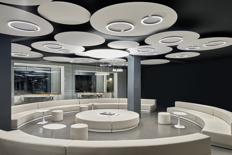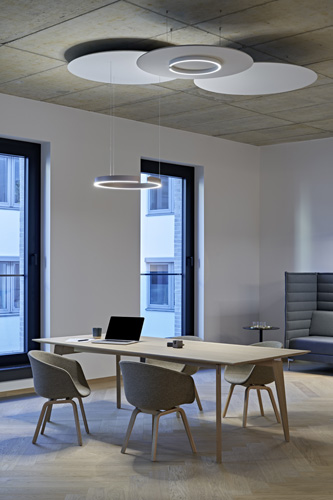 Die Occhio acoustic panels für Mito und Mito linear aus hochverdichtetem Polyester-Vlies bieten neben wirksamer akustischer Dämpfung neue Möglichkeiten der Deckengestaltung – und zusätzliche Reflektionsflächen für eine maximale Lichtausbeute. Die runden und rechteckigen Formate der Occhio acoustics sind zur Montage direkt an der Decke oder abgependelt erhältlich.