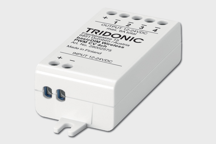 Das basicDIM-Wireless-PWM-CV-4CH-Modul wird mit 12-24 V DC versorgt und misst 72,6 x 30 x 18 mm. Über Bluetooth lassen sich bis zu vier Kanäle schalten oder dimmen, beispielsweise vier lineare LLE-FLEX-Lichtbänder oder auch ganz unterschiedliche angeschlossene Konstantspannungs-LED-Module. Bestehende LED-Lichtlinien können mit diesem Modul auf einfache Weise und ohne zusätzliche DALI-Leitungen oder -Treiber gedimmt werden. Der maximale Ausgangsstrom beträgt 6 A. Er kann beliebig auf die vier Kanäle aufgeteilt werden.