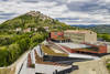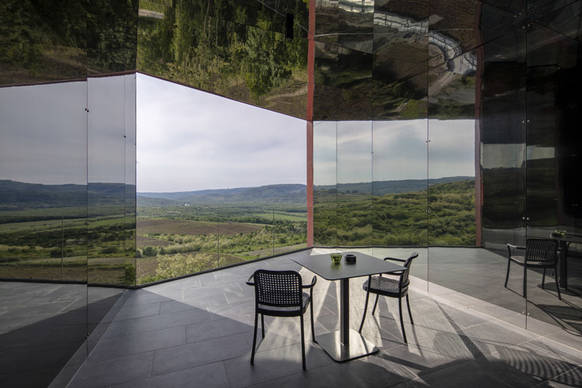Schon aus der Ferne zieht die imposante Anlage alle Blicke auf sich. Schräge Plateaus schieben sich zwischen dem Grün eine Anhöhe hinauf und erinnern an abstrakte Weinberge. Eine dynamische Formation aus Landschaft und Gebäude, die Geschichte und Zukunft zusammenbringt. Auf dem höchsten Punkt der Kuppe steht ein langgezogenes, altes Steinhaus. Das historische Gebäude von 1902 ist der „Motuvuner Keller“, unter dem sich die Original-Gewölbe erstrecken. Beide Bereiche wurde aufwändig saniert und durch moderne Architektur ergänzt. Überirdisch und unterirdisch. Denn eine Besonderheit des Roxanich Wine & Heritage Hotels ist seine räumliche Organisation: Tatsächlich liegen 70 Prozent der Anlage mitten im Hügel, inklusive des Roxanich Weinkellers, der aus dem alten Standort Roxanichs bei Nova Vas hierher umgezogen ist.