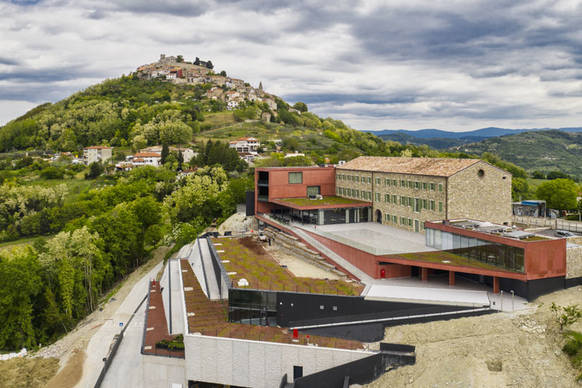 Das vom kroatischen Architekten Idis Turato geplante Ensemble steht zu Füßen eines steilen Hügels. Auf diesem schmiegen sich die Häuschen des gerade einmal 500 Einwohner zählenden Städtchens in den Hang. Eine Lage mit Panorama, touristischer Relevanz und bislang kaum genutzten Potentialen. Umgeben von Weingärten, mit Blick auf die Trüffelwälder von Livade und inmitten der kulinarisch aufstrebenden istrische Halbinsel soll die moderne Architektur in dem ländlichen Gebiet auch einen Raum der Begegnung schaffen.