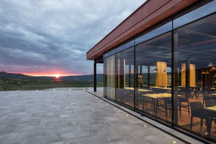 Im historischen Gebäudebestand ist jetzt das Hotel mit seinen 32 individuell eingerichteten Zimmern und Suiten untergebracht. Es verbindet den traditionellen istrischen Stil, der an Italien in den 1960er Jahren erinnert, mit modernem Design. An beiden Schmalseiten finden sich die modernen Ergänzungsbauten aus der Feder Idis Turatos, die durch ihre erdige, orangerote Fassade den Bestand einklammern. Die strenge Geometrie der Kuben und die großen Glasfronten wirken als harmonischer Kontrast zum alten Natursteinhaus mit seinen grünen Fensterläden. Die vier Etagen des Gewölbekomplexes sind jeweils einem Bereich des Weinherstellungsprozesses gewidmet. Der Weinbereitung und Mazeration, der Reifung und dem Archiv. Zum Hotel gehören außerdem ein Restaurant, ein Veranstaltungsraum, ein Spa, eine Lounge und ein Club.