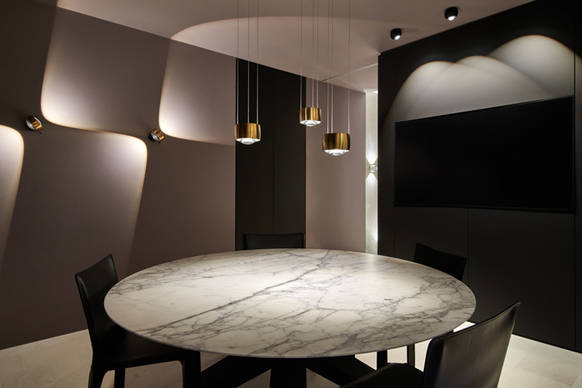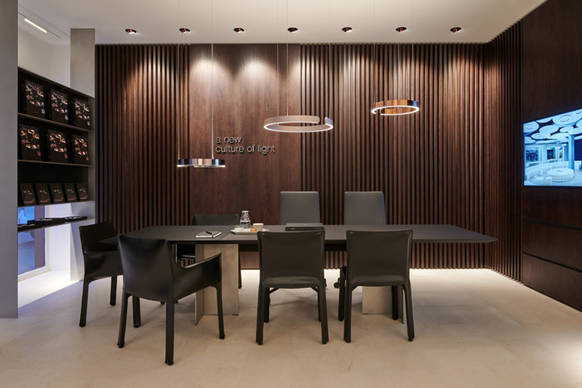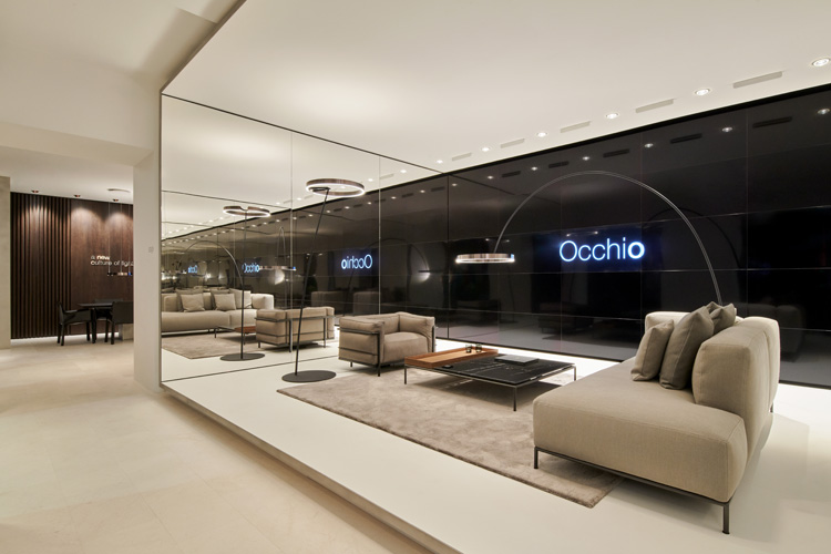 Das warme und wohnliche Ambiente greift italienische Designelemente auf. So wurden beispielsweise die Böden aus Stein des Herstellers Salvatori gestaltet und das Interior in Lounge- und Besprechungsräumen mit Möbeln von Cassina ergänzt. Im Showroom erlebt der Besucher die Wirkung von Licht und Lichtqualität im Raum und kann über Occhio air Steuerung interaktiv verschiedene Lichtstimmungen und -szenarien kreieren.