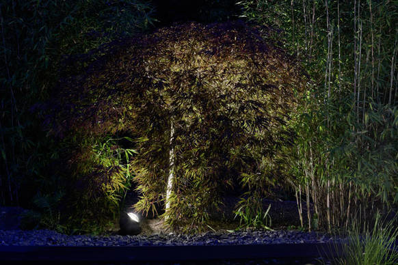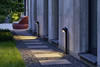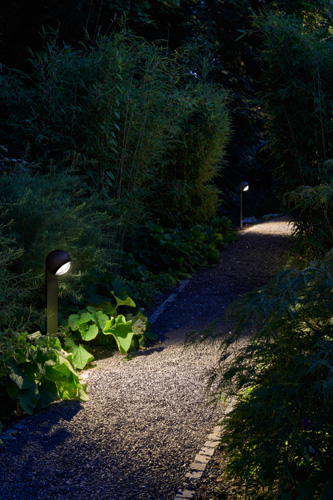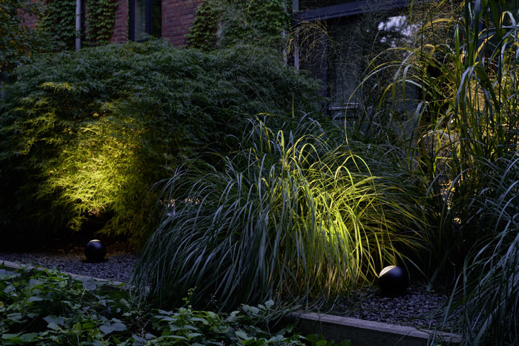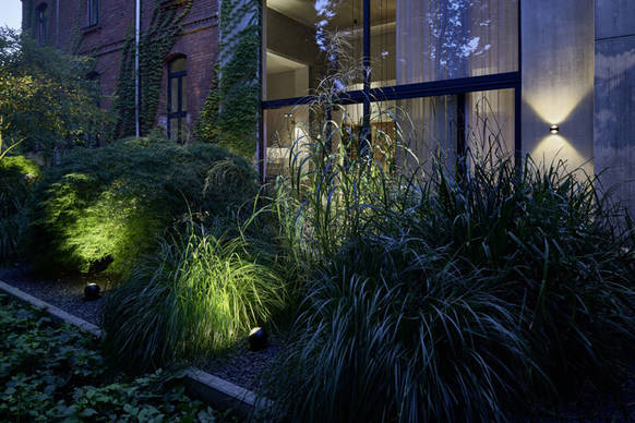 Im Garten ist die Architektur von verspielten Sträuchern und Gräsern geprägt. Sie werden punktuell von Sito basso Bodenstrahlern illuminiert, so dass kleine Lichtkuppeln entstehen, die die ästhetische Struktur des Gartens auch nachts nachzeichnen und gleichsam etwas Zauberhaftes bergen.