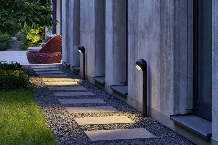 Elegant in Form und Erscheinung tragen die Pollerleuchten Sito palo entlang der rohen Hausfassade den hohen Qualitäts- und Designanspruch von Occhio vom Wohnraum in die Natur. Ihr Lichtschein legt sich dabei wie ein sanfter Saum um die Fassade. Dadurch entstehen auch abends Sichtbezüge in den großzügigen Garten. Zugleich leiten die Pollerleuchten als Wegbegleiter aus Licht durch den wild anmutenden Garten. Sito palo in schwarz matt ergänzen das Gartenkonzept und sorgen zugleich für die optimale Lichtverteilung auf den Wegen.