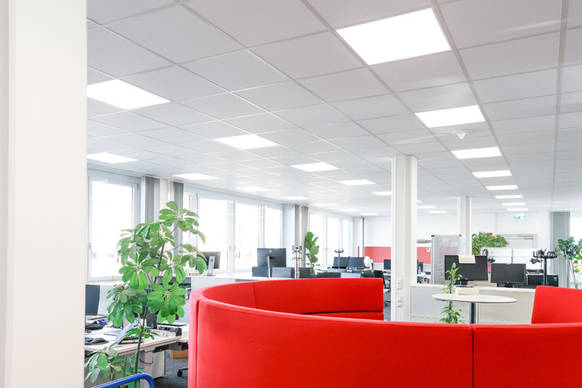 In den Büroräumen ersetzte das Projektteam im Rahmen eines eins-zu-eins-Austauschs 2.300 Einlegeleuchten in Rasterdecken durch moderne, energieeffiziente LED-Panels. Etwa 50 Sensor-LED-Leuchten mit integrierter Präsenzsensorik sorgen in den Treppenhäusern mit vier Lichtfunktionen – Grundlicht, Backlight, dimmbares Hauptlicht und Notlicht – für eine bedarfsgerechte Ausleuchtung. Auch die Beleuchtung der Tiefgarage wurde vollständig modernisiert: Dort kommen nun mehr als 500 neue LED-Feuchtraumleuchten zum Einsatz.