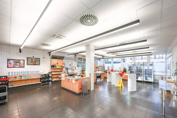 Auch im Kantinenbereich sollten die neuen Leuchten exakt an den bisherigen Positionen installiert werden, um die vorhandenen Stromauslässe weiter nutzen zu können und ein einheitliches Erscheinungsbild zu bewahren. Das Planungsteam löste diese Vorgabe durch moderne LED-Lichtkanäle, die für eine gleichmäßige Ausleuchtung sorgen und zusätzliche Möglichkeiten zur Akzentbeleuchtung bieten. Die Beleuchtungskörper aus hochwertigem schwarzen Aluminiumprofil fügen sich elegant in das Raumdesign der Kantine ein.