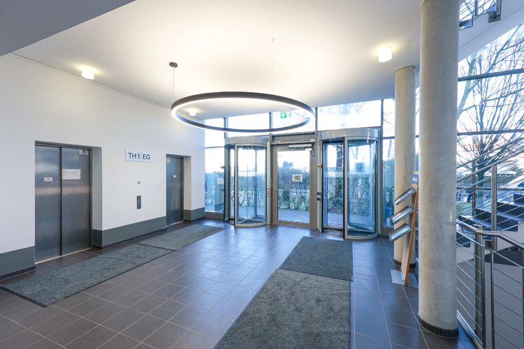 Zwar stand bei der Sanierung die Funktionalität im Vordergrund, doch integrierten die Licht-Experten einen Eyecatcher in das Konzept, der im Eingangsbereich für einen markanten gestalterischen Akzent sorgt: Eine runde LED-Pendelleuchte mit 60 Millimeter Aluminiumprofil, schwarz lackiert. Diese Ringleuchte greift die Form der vorhandenen Eingangstrommel auf, strahlt die Decke an und verleiht dem Gebäude schon beim Betreten eine hochwertige, einladende Atmosphäre.