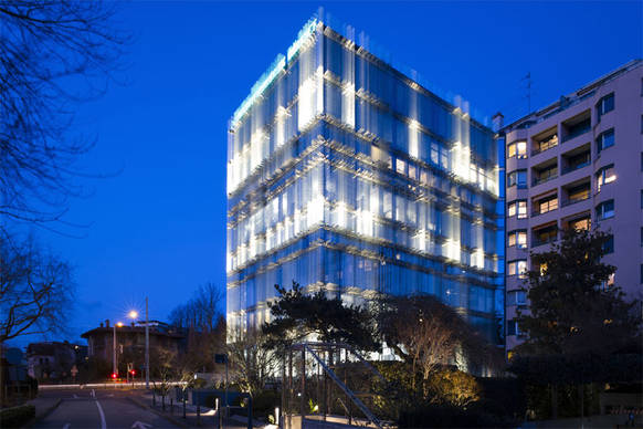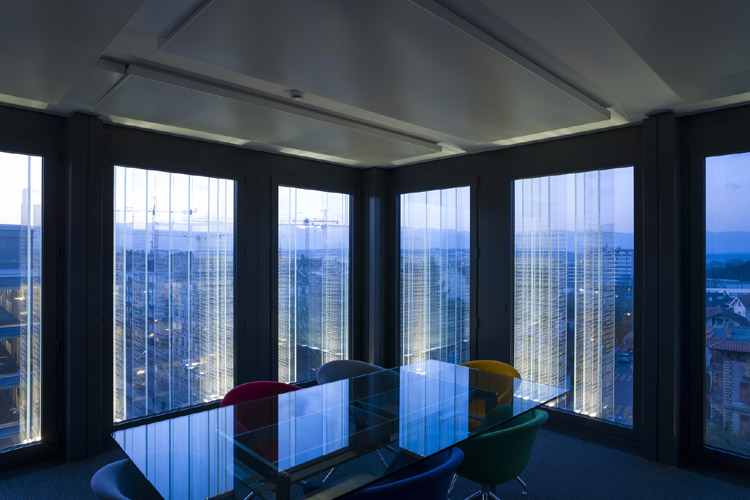 Diese hüllt den Büroblock in eine Art Nebel aus Glas, der die Gebäudekonturen verschwimmen lässt und die Innenräume gegen neugierige Blicke von außen schützt. Die vorgesetzten Glaslamellen fungieren tagsüber als Sonnenschutz. Sie verschatten die Büroräume und sichern so den hohen Sehkomfort an den Arbeitsplätzen sowie durch ein kontrolliertes Raumklima die Energieeffizienz des Gebäudes. Dennoch bleibt eine gewisse Durchlässigkeit des Gebäudes erhalten – und der Ausblick in die malerische Umgebung, auf die Berge und den Genfer See aus den Innenräumen ist nach wie vor möglich. Die neue Glasfassade macht das Gebäude unverwechselbar, verleiht ihm einen eleganten, repräsentativen Charakter. Nachts scheinen die Gebäudekonturen hinter der dezent beleuchteten transparenten Hülle zu verschwimmen, die Gebäudekante scheint sich nach oben hin aufzulösen.