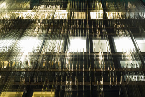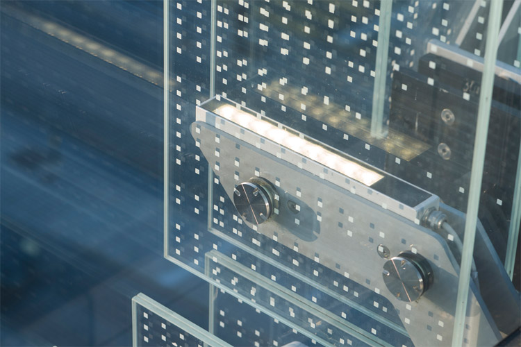 Die Lichtwirkung sowie das Zusammenspiel von Fassadenleuchten und bedruckten Glaslamellen wurde anhand eines mehrere Meter großen Modells vor Ort getestet. Auf drei Niveaus innerhalb der acht Stockwerke umfassenden Fassade wurden schließlich insgesamt 290 LED-Fassadenleuchten installiert. Sie sitzen, für das Auge des Betrachters unsichtbar, in dem teilweise nur 45mm schmalen Spalt zwischen den Glaslamellen. Denn: "Nicht die Leuchten sollten für den Betrachter sichtbar sein, nur die Lichtwirkung", erklärt Simon Simos. Die mögliche Miniaturisierung mit LED wurde bei der Konzeption der Leuchten auf die Spitze getrieben. ERCO lieferte schließlich zwei Varianten einer leistungsstarken und dabei extrem schmalen Außenleuchte mit gefrästem Aluminiumgehäuse und IP67-Schutz.
