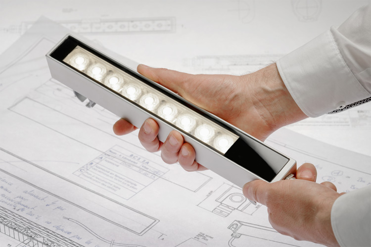 Auf Grundlage eines Katalogartikels wurden sowohl eine 20cm lange als auch eine 30cm lange Variante entwickelt, bei denen sechs bzw. neun LEDs in Reihung sitzen. Diese zwei Varianten entsprechen den Dimensionen der Glaslamellen, die in ihrer Tiefe, Höhe und den Abständen zueinander variieren. Die Gehäusefarbe der Leuchten wurde angepasst an die silber eloxierten Befestigungsbügel der Glaslamellen. Die Montage der Fassadenleuchten erfolgt schnell und einfach über einen einschnappenden Clip. Die Abstrahlcharakteristik narrow spot schafft ein eng gebündeltes Streiflicht, das leicht seitlich auf die mit kleinen weißen Quadraten bedruckten Glaslamellen fällt. Diese reflektieren das Licht und erzeugen so den fast unwirklichen Effekt der Fassade bei Nacht. Simon Simos erklärt: "Je nach Betrachtungswinkel entsteht eine optische Illusion, eine Art Unschärfe. Das Gebäude scheint sich in der Dämmerung zu entmaterialisieren."