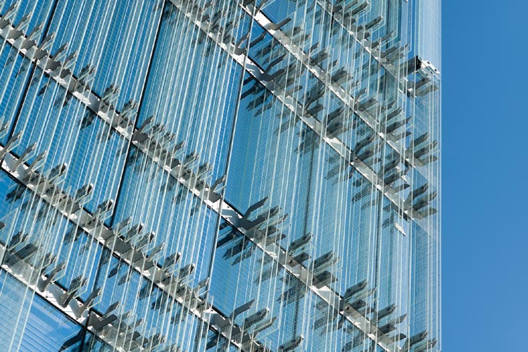 Im Vordergrund der Sanierung des aus den 1970er Jahren stammenden achtgeschossigen Bürogebäudes des Schweizer Immobilienunternehmens SPG Société Privée de Gérance am Stadtrand von Genf stand die Verbesserung der Arbeitsplatzqualität. Giovanni Vaccarini Architekten ersetzten die alte Glasfassade durch eine neue Dreifach-Isolierverglasung und ergänzten davor noch eine "zweite Haut" aus fast 2900 mit einem Quadratraster bedruckten, vertikal ausgerichteten Glaslamellen.