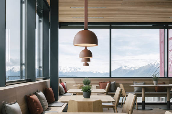 Die Entscheidung für den Farbton Terra Red bei den Plusminus-Elementen bei den verschiedenen Kugel- und Halbkugelleuchten über Tischen und Treppe - versteht sich als farbliche Hommage an die ikonische Station, deren kubische Form dem neuen Restaurant seinen Namen gibt. Das Gesamtergebnis seiner Umgestaltung wurde durch eine stimmige Verbindung von Materialien und Farbtönen erreicht, die einerseits einen sportlich-jugendlichen Charakter vermitteln, andererseits aber auch eine warme, gemütliche Atmosphäre schaffen, die zu angenehmen Momenten nach dem Essen einlädt, während man die Kulinarik und das Panorama der Tiroler Berge genießt.