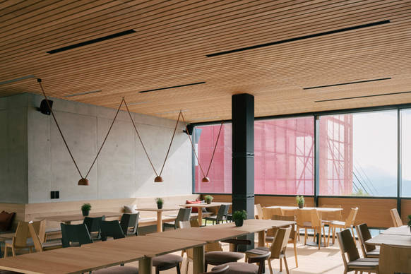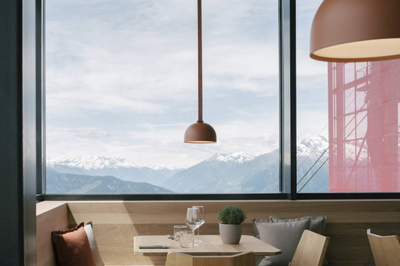 An der Bergstation befindet sich das Restaurant CUBUS, das vom Studio biquadra jüngst umgestaltet wurde - mit einer Renovierung, die die architektonische Identität des Gebäudes bewahrt. Der vom Architekturbüro Roland Baldi entworfene massive Kern aus Sichtbeton kontrastiert mit der großzügigen Pfosten-Riegel-Verglasung der Fassade, wodurch ein spannungsvolles Zusammenspiel zwischen struktureller Robustheit und offener Transparenz entsteht.