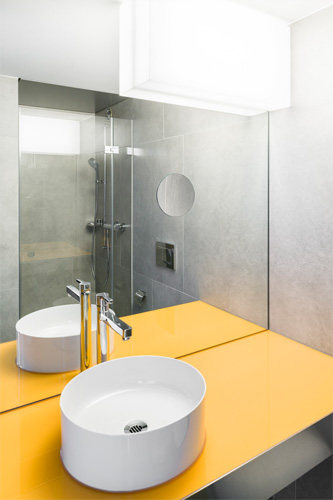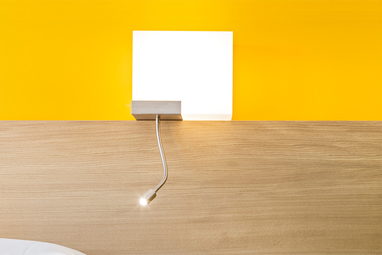 Dass Reduktion durchaus vielseitig sein kann, zeigt sich in der klaren Fortsetzung der Hotel-Architektur und des Lichtdesigns in den 167 Gästezimmern. Hier zieht sich die skulpturale Formgebung der Leuchtkörper in den Wand- und Stehleuchten sowohl im Wohnbereich als auch im Bad durch und unterstreicht mit einzelnen oder miteinander versetzt verbundenen Lichtquadern die reduzierte Modernität und Einrichtung. Warmweiße LEDs sorgen für eine angenehme Lichtatmosphäre. Die Wandleuchten bei den Betten verfügen über ein zusätzliches, schwenkbares LED-Leselicht. Im Bad überzeugt das diffus-weiche Licht durch absolute Blendfreiheit im Spiegelbereich.
