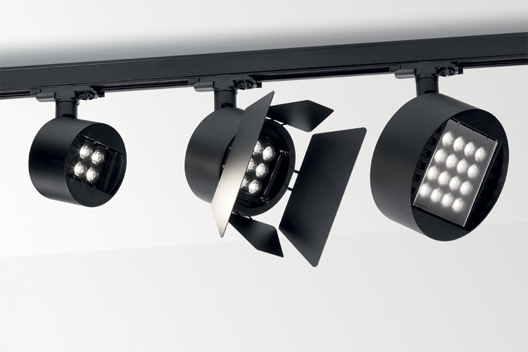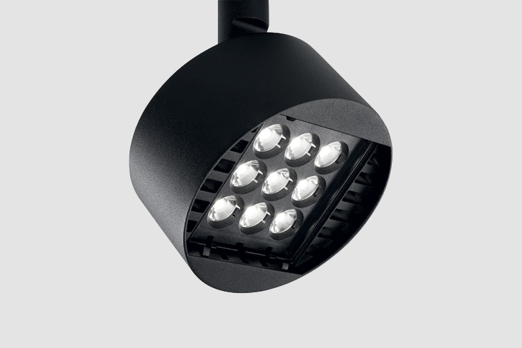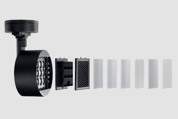 Den runden Strahler in Schwarz oder Weiß mit Farbwiedergabeindex CRI>90 gibt es in drei Bestückungsvarianten mit 2 x 2, 3 x 3 und 4 x 4 LED-Clustern. Entsprechend variieren seine Durchmesser von 120 bis 190 mm. Der große Fragma Strahler bringt es auf 4.600 lm. In der Grundausstattung wird die Leuchte mit Einzel-Linsen zur Spotbeleuchtung geliefert (14°). Um Abstrahlwinkel von 26° oder 47° zu erhalten, wird einfach ein ultradünner Mikrolinsen-Vorsatz werkzeugfrei vor die gesamte Optik gesetzt. Einen solchen Vorsatz gibt es auch für Weichzeichnungs-, Wallwasher- und Ellipsen-Effekte. Ein als Zubehör angebotetenes Raster oder Wabenraster schützt vor Blendung.