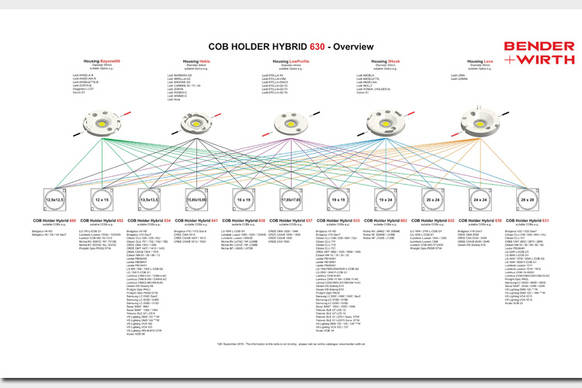 Die Serie 630 ist modular aufgebaut und erlaubt nahezu beliebig viele Kombination von COBs und Optiken. Die Bodenplatte ist austauschbar, während die obere Platte die optische Schnittstelle enthält. Das Programm startet mit ca. 120 verschiedenen Varianten.