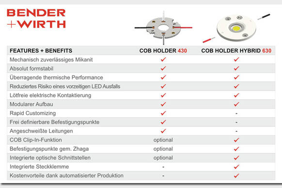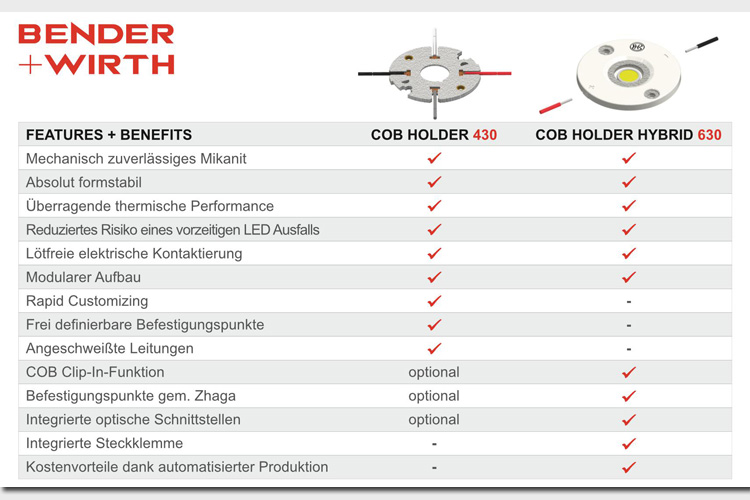 Der Halter verbessert den Wärmeübergang zwischen COB und Kühlkörper. Das Mikanit sorgt für eine zuverlässige Verbindung zwischen COB und Kühlkörper und reduziert so das Risiko eines vorzeitigen LED Ausfalls. Eine Integrierte Steckklemme, COB Clip-In-Funktion und Befestigungspunkte gem. Zhaga zeichnen das modulare Kunststoffgehäuse aus.