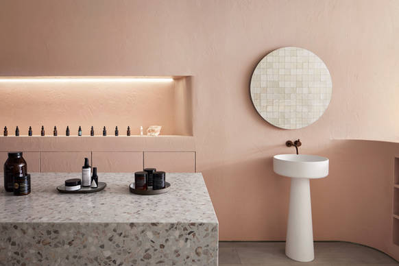 Zartrosa Wände, Fußböden mit breiten Holzdielen und eine dezente Einrichtung verleihen dem Wellness-Center ein mediterranes Flair. In einem der Räume, die zur Meditation genutzt werden, wurde außerdem das CoeLux-System HC 45 Sun&Moon installiert, das wesentlich zur natürlichen und beruhigenden Atmosphäre des Raums beiträgt.