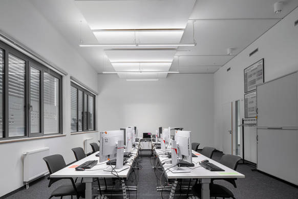 Für dieses Projekt wurden zwei verschiedene LEDVANCE-Leuchten ausgewählt, die von der Decke abgependelt und flexibel aufgehängt werden können. Die Leuchte LINEAR INDIVILED DIRECT/INDIRECT kann über DALI gesteuert werden und ist mit Bewegungssensoren sowie Tageslichterfassung ausgestattet. Die mit DALI-Steuergeräten betriebene Leuchte PANEL DIRECT/INDIRECT überzeugt durch ihre flache Bauform und homogenes Licht. Mit der Lichtlösung von LEDVANCE werden die von der Arbeitsstättenverordnung geforderten 500 Lux Licht im Raum flächendeckend erreicht und gleichzeitig der Wunsch des Kunden nach flexibler Raumnutzung erfüllt.