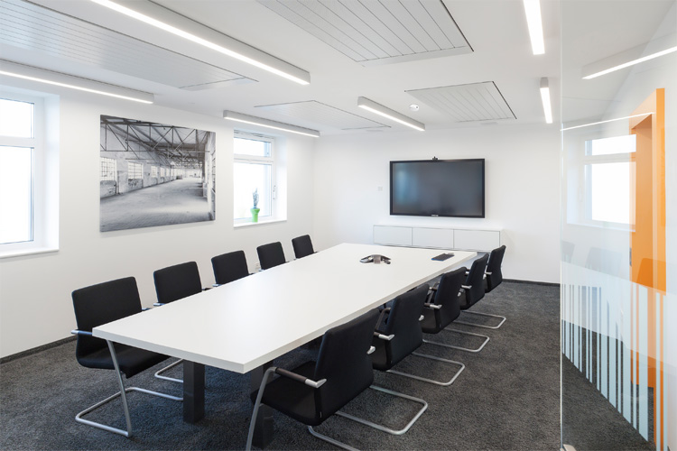 Ausgehend von einem Besprechungsraum mit zwei Leuchtengruppen genügt in der Regel die Installation eines leistungsstarken Präsenzmelders wie dem LuxMaster True Presence APC von STEINEL zur Lichtsteuerung. Anhand von Mikrobewegungen erkennt dieser erste echte Präsenzmelder die Anwesenheit von Personen. Mit einem 64 qm großen True Presence-Erfassungsbereich ist er ideal für die Installation in einem Besprechungsraum, wobei sein Erfassungsbereich digital exakt eingestellt werden kann.