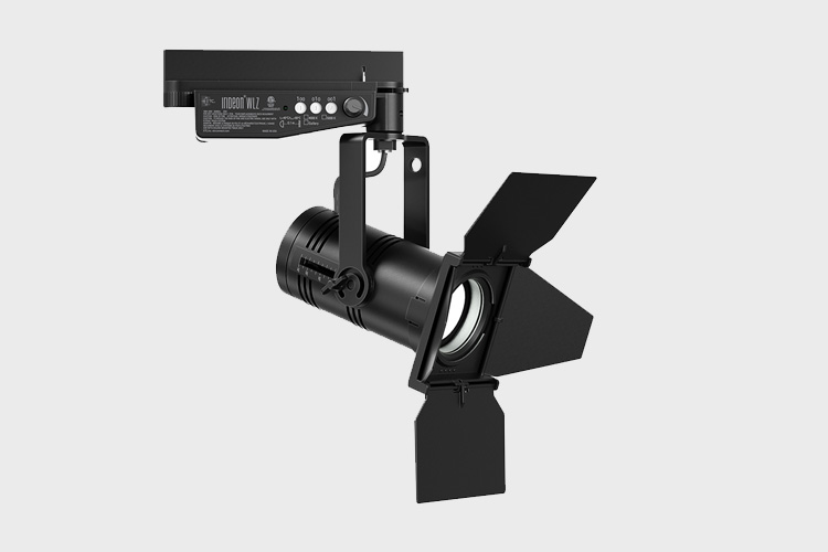 Bei Verwendung eines Stromschienensystems sind sowohl 3-Phasen Stromschienen für den 230V-Markt, als auch 2-Kreis DataTrack-Schienen für 120V-Märkte möglich. Jeder Scheinwerfer kann für DMX-gesteuertes Dimmen einzeln adressiert oder über den Poti am Schienenadapter eingestellt werden. Neben der DMX-Steuerung sind die Geräte zur Deckenmontage auch in der Ausführung zur 0-10V- oder DALI-Ansteuerung erhältlich. Das gleichmäßige, helle Washlight kann optional mit dem Flügeltorzubehör geformt werden.