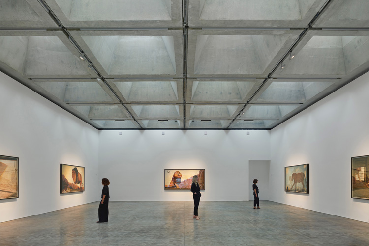 Rhythmus und Flexibilität - Neben einer großzügigen Ausstellungsfläche beherbergt die neue Galerie auch private Betrachtungsräume und Büros. Der Hauptausstellungsbereich, der für großformatige Kunstwerke konzipiert ist, ist ein stützenfreier, 280 Quadratmeter großer Raum mit 7 Meter hohen Wänden und einem polierten Betonfußboden. Die Decke besteht aus 28 trapezförmigen Betonkassetten, in denen sich jeweils ein großes Oberlicht befindet, das für diffuses natürliches Tageslicht sorgt. Verstärkt wird dies durch die große Glasfront. Die Waffelstruktur des Deckenrasters schafft nicht nur einen architektonischen Rhythmus, sondern ermöglicht auch maximale Flexibilität bei der Aufteilung des Raumes.