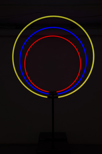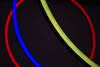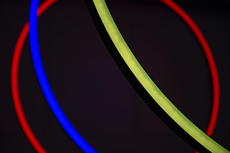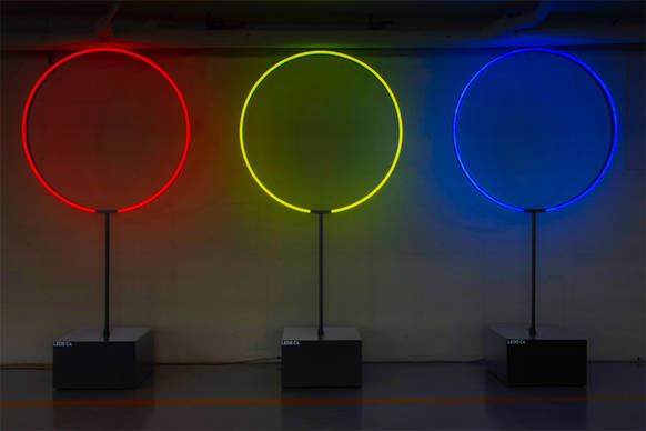Jeder Ring leuchtet in einer der drei leicht zu unterscheidenden Grundfarben: rot, blau und gelb. Mit jeder Farbe werden die verschiedenen Festivalpunkte gekennzeichnet: Installationen (rot); Schulen (blau) und externe Kooperationen des Festivals (gelb).