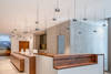 Gewählt wurden direktstrahlende, graue ARVA Linsenpendelleuchten. Urs Eggenschwiler wollte bei der Beleuchtung möglichst wenig Indirektanteil an der Decke, der Lichtanteil sollte klar auf der Theke liegen. „Die Patienten sollen dort empfangen werden, wenn sie den Raum betreten. Wir wählten ausserdem dunkle Leuchten, damit die Lichtkörper trotz dem einfallenden Tageslicht wahrgenommen werden und ihre Wirkung entfalten.“