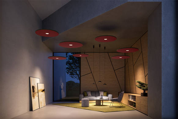 Akustisch wirksame Accessoires für SLOTLIGHT round acoustic, LIGHT FIELDS III acoustic und PANOS III R 200 acoustic ergänzen bestehende Leuchten um Schallabsorption. Die raumüberspannende Lichtdecke CIELUMA bringt tageslichtähnliches Flair in Innenräume und wirkt zugleich schallabsorbierend. Die Pendelleuchte TRAMAO bildet eine Einheit aus Licht, Materialität und Farbigkeit – als Basis für durchgängige Konzepte in Büro-, Hospitality- und Bildungsprojekten.
