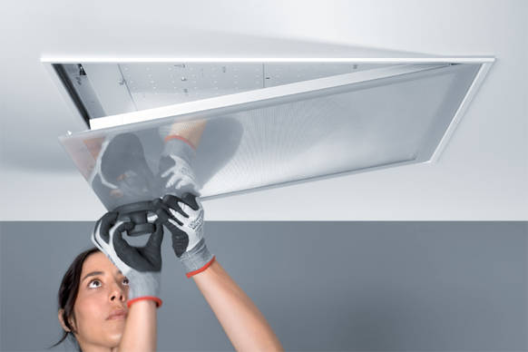 Eine Besonderheit der CLEAN II supreme ist die mehrschichtige Mikropyramidenoptik MPO+. Das Licht wird kontrolliert gebrochen und geführt, sodass auch bei steilen Abstrahlungswinkeln eine angenehme Lichtverteilung entsteht. Ergänzend ermöglicht die CLEAN II supreme essential Variante mit Hintergrundbeleuchtungstechnologie die Wartung und Montage, ohne dass die Light Engine entfernt werden muss, und bietet direkten Zugang zu allen Bauteilen, sobald die Abdeckung entfernt wird.